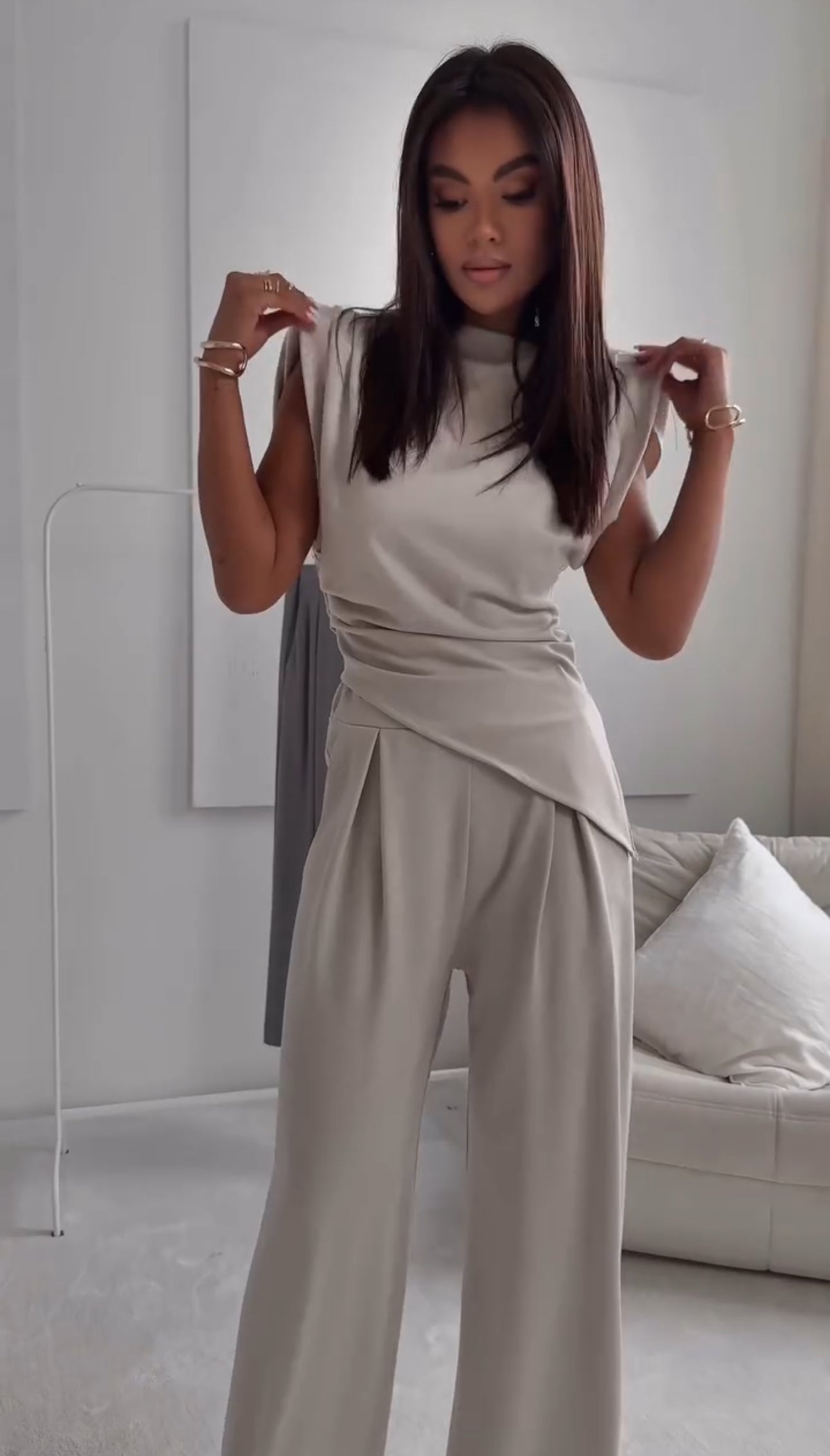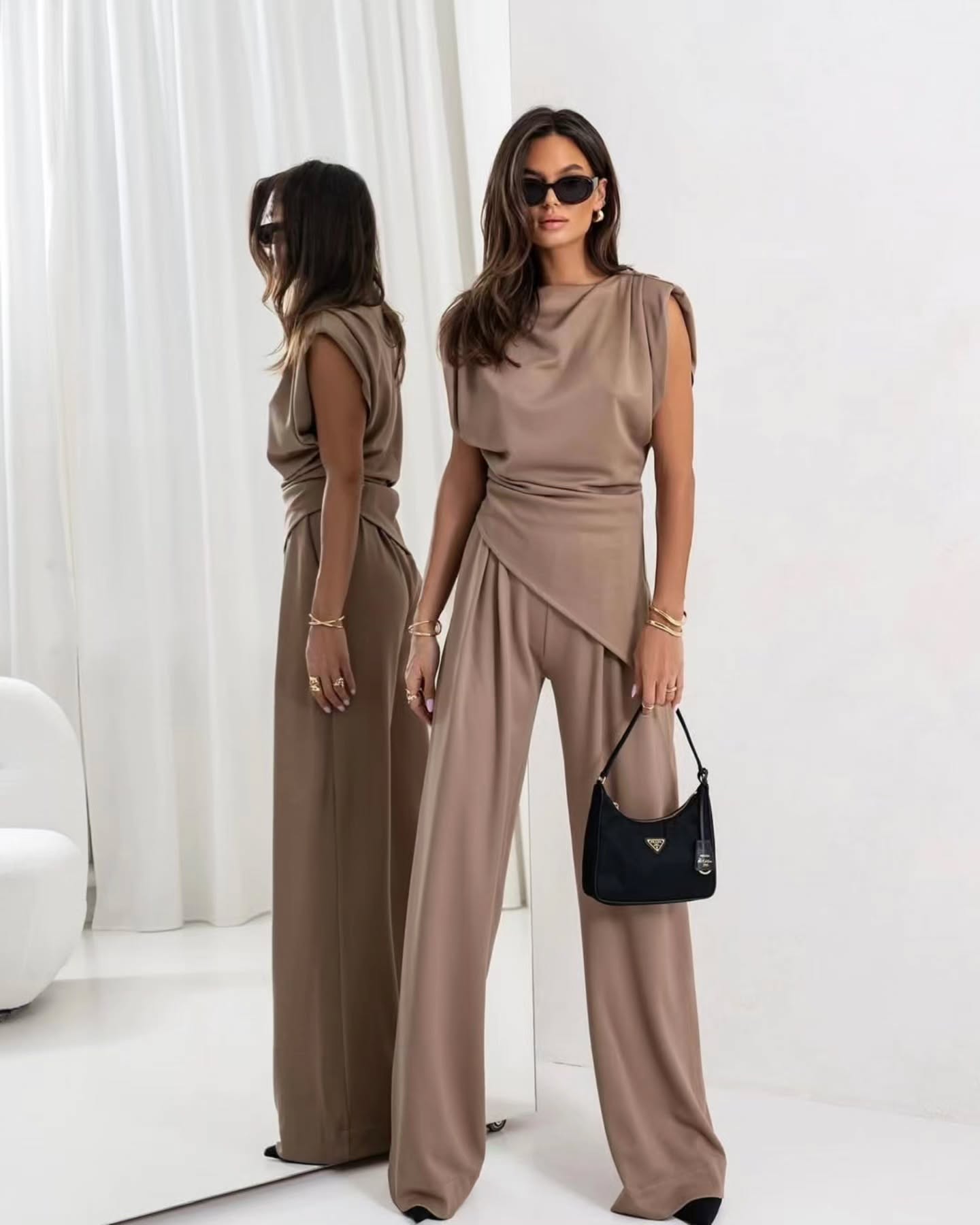 Combinaison blouse et pantalon à la coupe élégante. Épaules ouvertes. Fabriqué dans un tissu agréable.